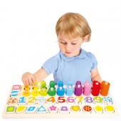 Asocieri vizuale intre cifra - ca figurina din lemn si numarul de inele colorate corespunzatoare.