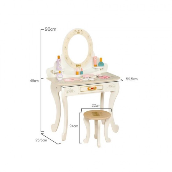 Un set de joaca rafinat, care ofera copiilor o experienta plina de imaginatie si distractie. Cu un design elegant, materiale de calitate si accesorii incluse, aceasta masuta este perfecta pentru micii exploratori ai lumii machiajului si ingrijirii personale. Setul include si un scaun confortabil, perfect dimensionat pentru copii. Ve-i gasi o serie de accesorii de machiaj de jucarie, cum ar fi perii, sticlute de parfum si alte produse cosmetice. Aceste accesorii sunt sigure pentru copii astfel incurajand imaginatia si creativitatea.