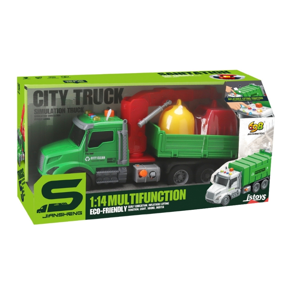 Camion cu remorca, macara si tomberoane, frictiune, buton presiune, sunete si lumini, 1:14, jstoys, ZJA363787