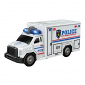 Ambulanta politie emite sunete specifice, cum ar fi zgomotul sirenei, care imita sunetul real al unei autospeciale. Echipata cu lumini care se aprind in timpul utilizarii, camionul adauga un element vizual atragator. Jucaria asigura un mecanism de frictiune, care ii permite sa se deplaseze inainte dupa ce este usor impinsa.
