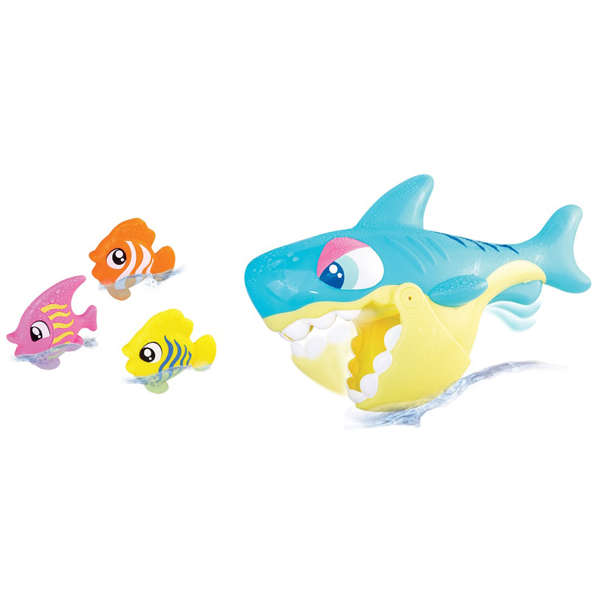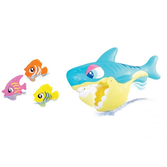 Rechinul are un mecanism simplu si amuzant: apasati pe inotatoarea lui, iar el deschide gura ca sa prinda pestisorii. Pestisorii plutesc la suprafata apei, astfel incat copilul ii poate prinde si aseza usor in gura rechinului. Culorile vii si tema marina stimuleaza curiozitatea, jocul de rol si creativitatea.