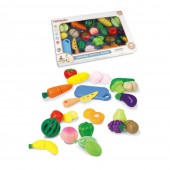 Un set adorabil si interactiv ce include o varietate de fructe si legume de jucarie care pot fi "taiate" cu ajutorul unui cutit de jucarie. Fiecare fruct si leguma este impartita in doua parti, care se pot conecta printr-un "arici" (tip velcro), pentru a imita taierea reala.