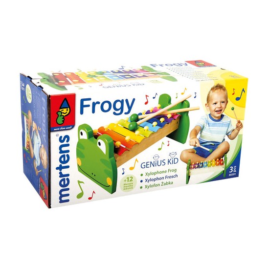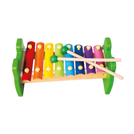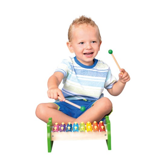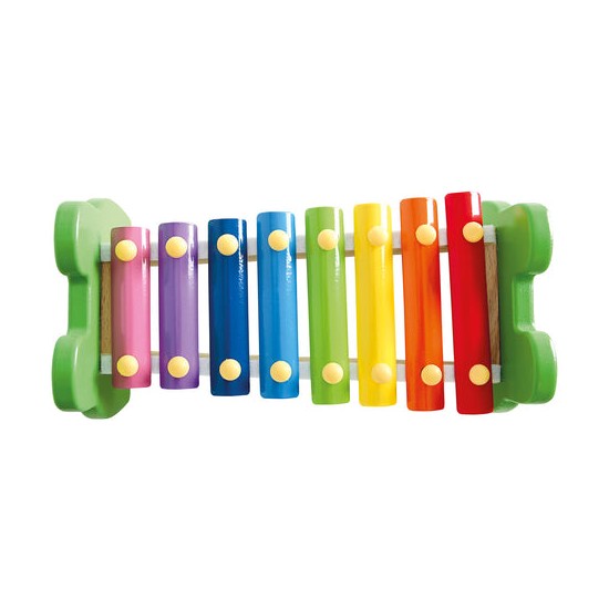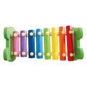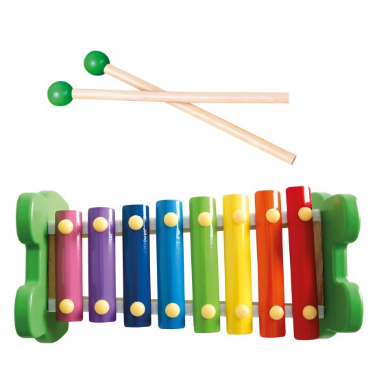 Xilofonul este imprimat cu elemente grafice atragatoare si vine frumos prezentat intr-o cutie de lemn, alaturi de cele 2 bete pentru percutie, pentru a fi mereu la indemana micilor muzicanti.