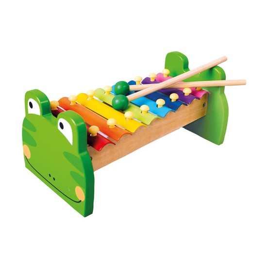 Xilofon Broasca pentru copii, din lemn si metal, frumos colorat si prevazut cu 8 note muzicale.