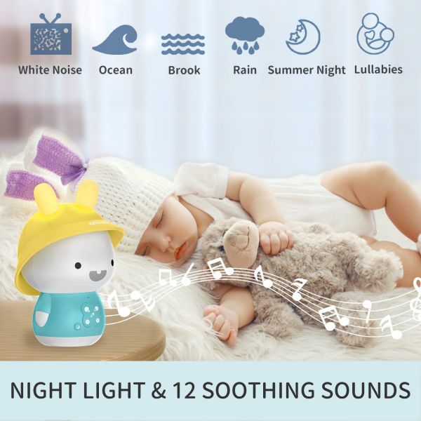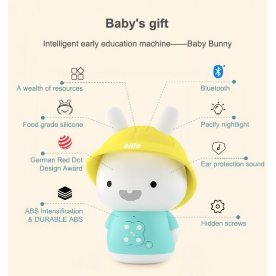 Baby Bunny Alilo este un prieten de incredere pentru cei mici. Caciula iepurasului este facuta dintr-un silicon special care poate fi indepartat si muscat. Semnele de pe butoane sunt foarte intuitive si usor de apasat, pentru a le fi celor mici usor sa treaca de la o melodie la alta sau de la o poveste la alta. O lumina de noapte cu lumina relaxanta se asigura ca micutului tau nu ii va fi frica sa adoarma in intuneric. Cu o incarcare completa a bateriei, iepurasul va continua sa functioneze timp de peste 6 ore! Baby Bunny Alilo are o conexiune Bluetooth magica ce permite conectarea acestuia la o multime de dispozitive electronice. Poti alege cantecul de leagan preferat al bebelusului tau si iepurasul il va reda. Iepurasul Alilo vine echipat cu un card de memorie ce contine 24 cantece in limba romana, 16 povesti in limba romana, 16 povesti in limba engleza si peste 50 de cantece pentru copii in limba engleza.