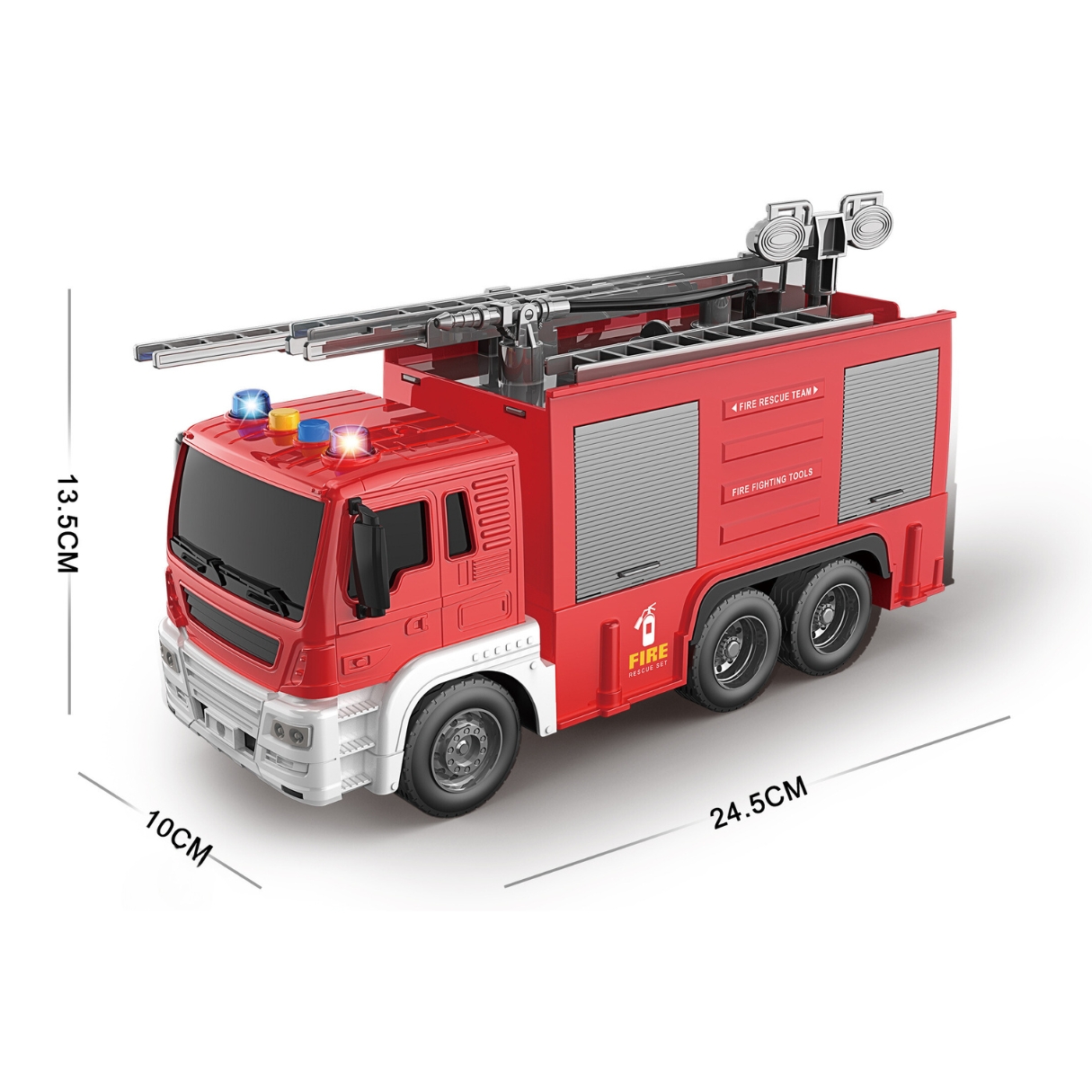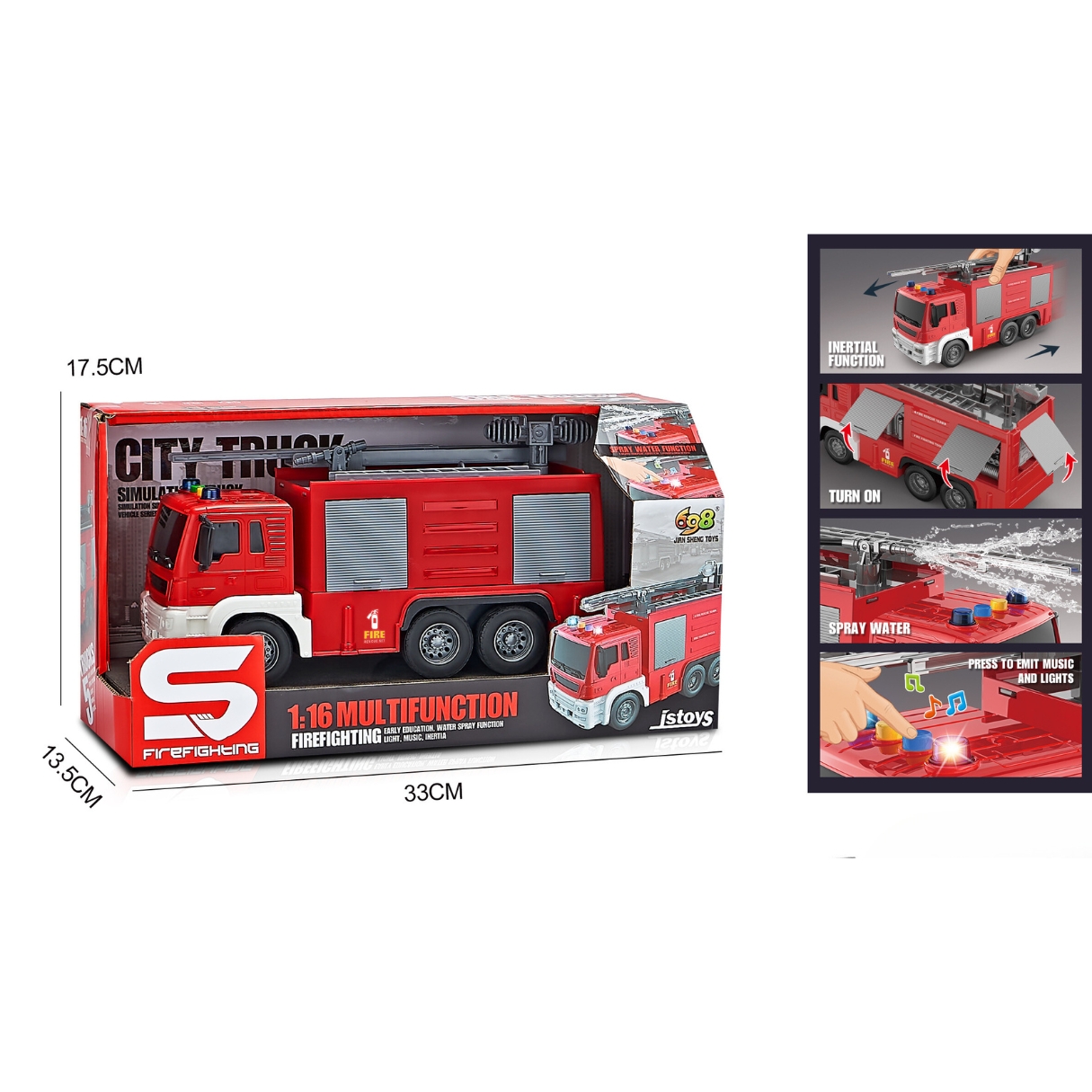 Masina de pompieri cu furtun de apa, cu frictiune, lumini si sunete, 1:16, jstoys