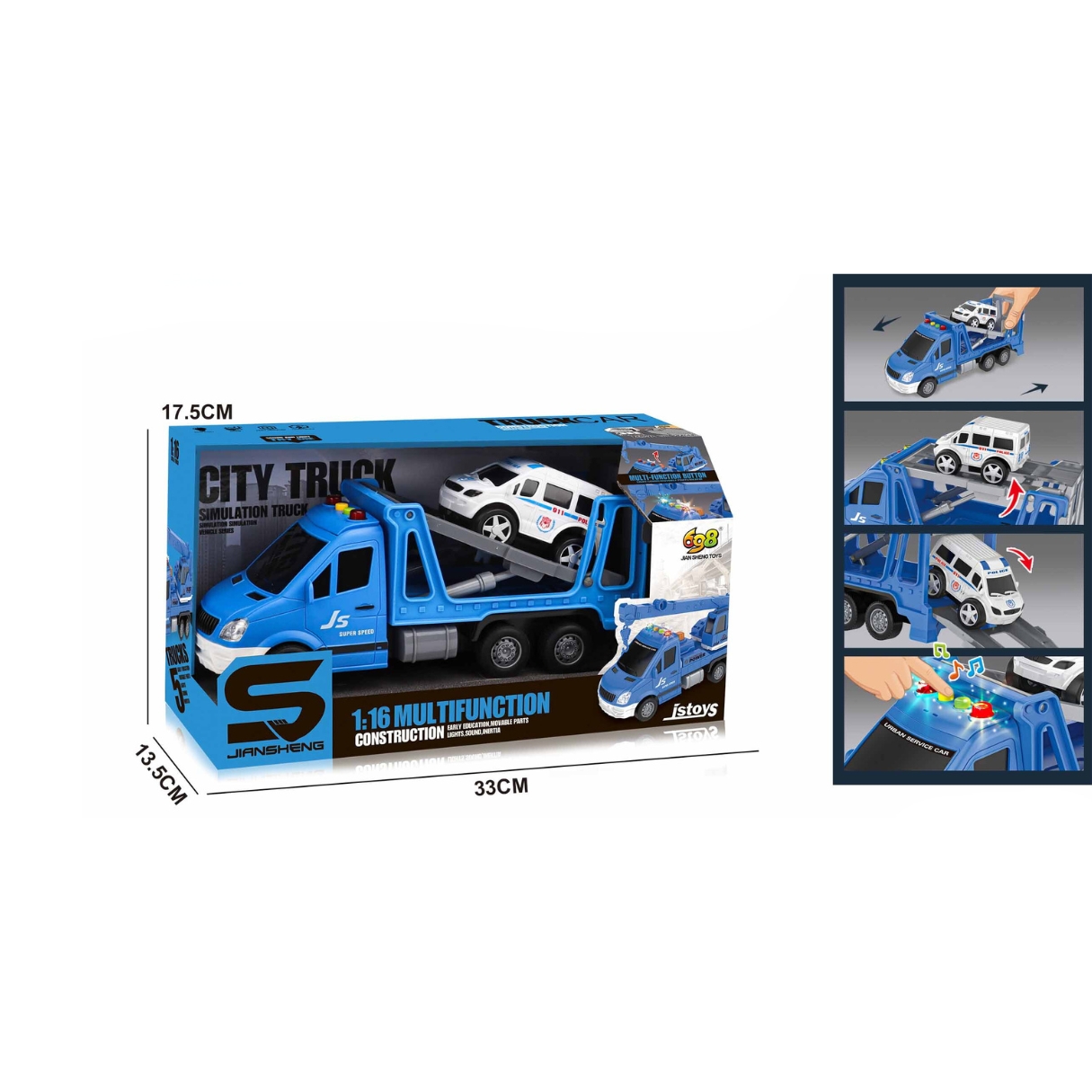 Evacuator albastru, cu masina alba, cu frictiune, sunete si lumini 1:16, jstoys
