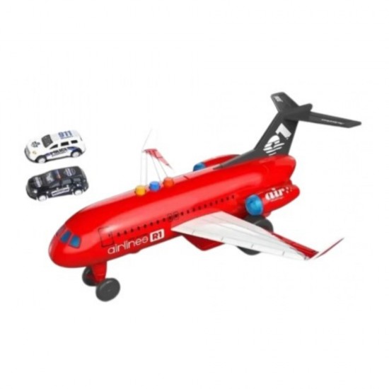 Avion cu frictiune rosu si 2 masinute, sunete si lumini, 1:16, jstoys, ZJA347494