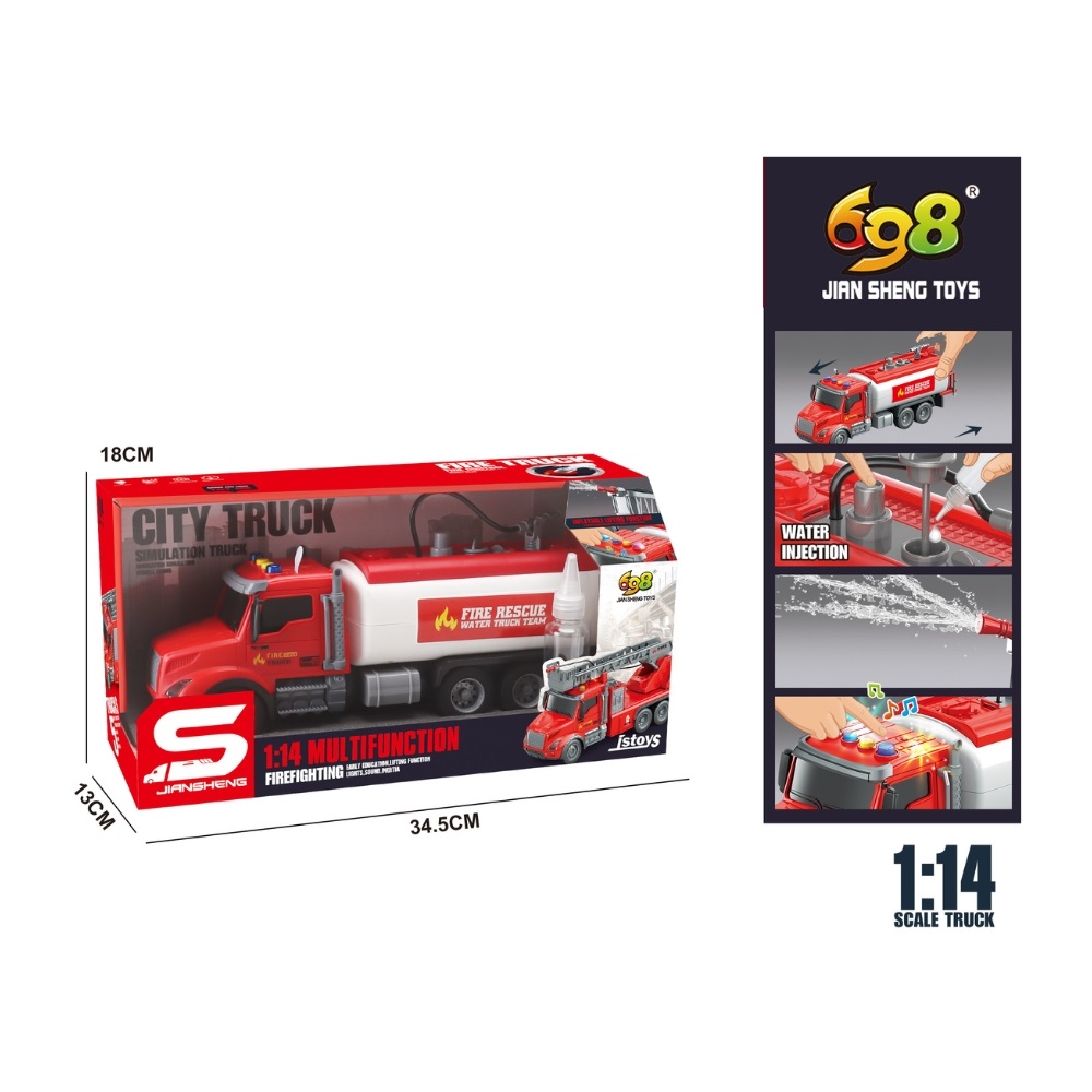 Camion pompieri cu cisterna, buton apa, frictiune, sunete si lumini, 1:14, jstoys, ZJA363794