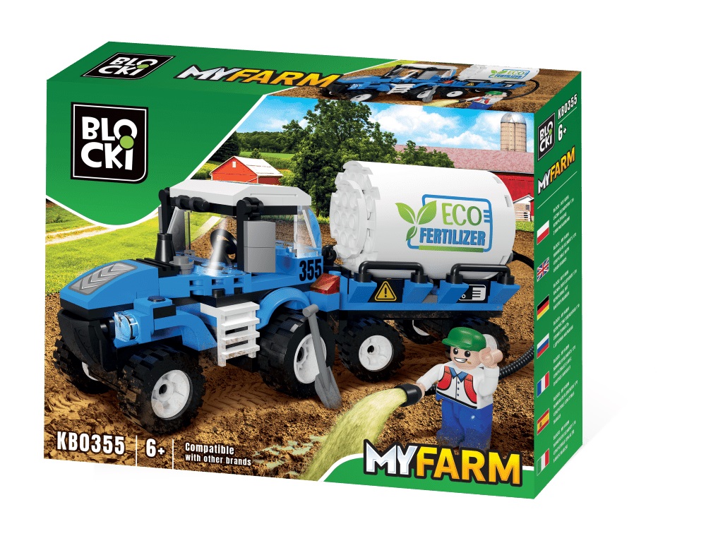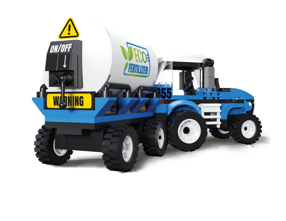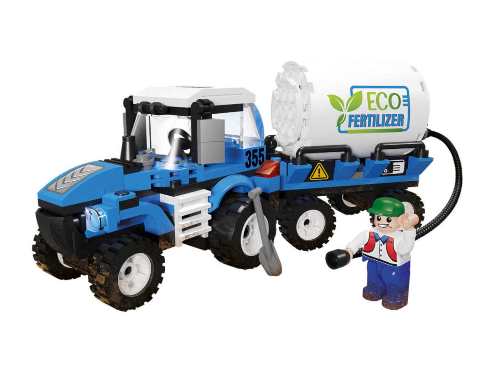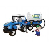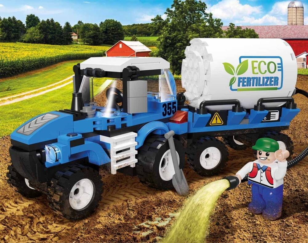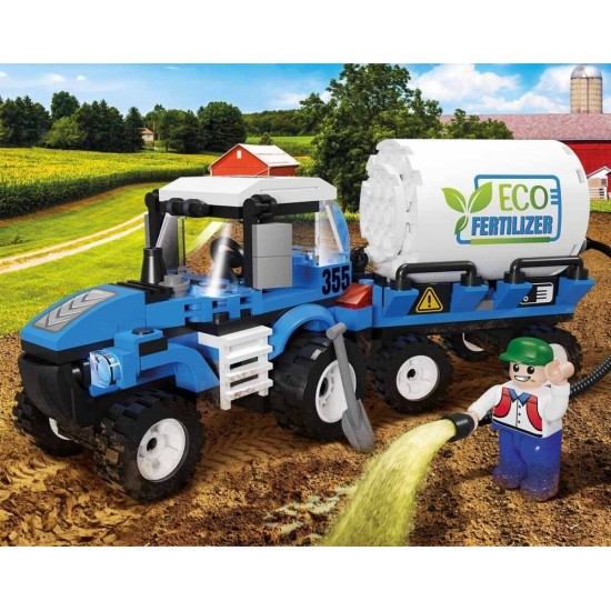 Kitul este format din piese care se combina intr-un tractor albastru, unic, cu o cisterna de apa pentru ingrasaminte organice. Desigur, setul nu ar putea fi complet fara accesorii precum un furtun pentru o cisterna sau o lopata si mini figuria fermier.