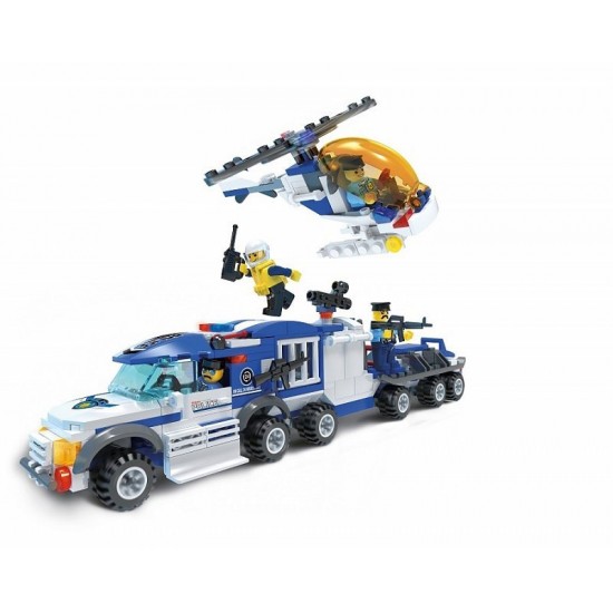 Utilizati elementele incluse in set pentru a construi un elicopter politie si o figurina politist cu statie emisie-receptie.
