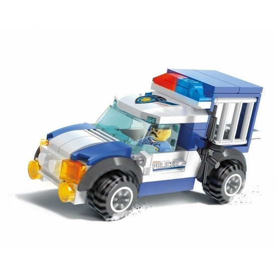 Utilizati elementele incluse in set pentru a construi o masina de politie pentru transportul infractorilor. Setul contine si o figurina politist.