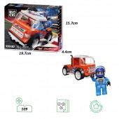Setul contine 100 piese si o figura pilot de curse.