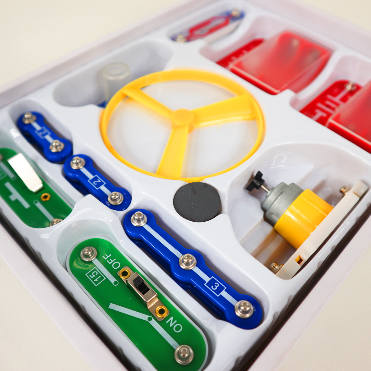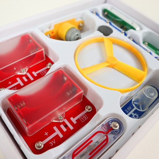 Constructorul ofera 15 circuite diferite, pentru asamblare vei putea folosi conductori, elemente de putere, intrerupatoare, lampi si motoare electrice, asamblandu-le vei descoperi multe lucruri noi si interesante.