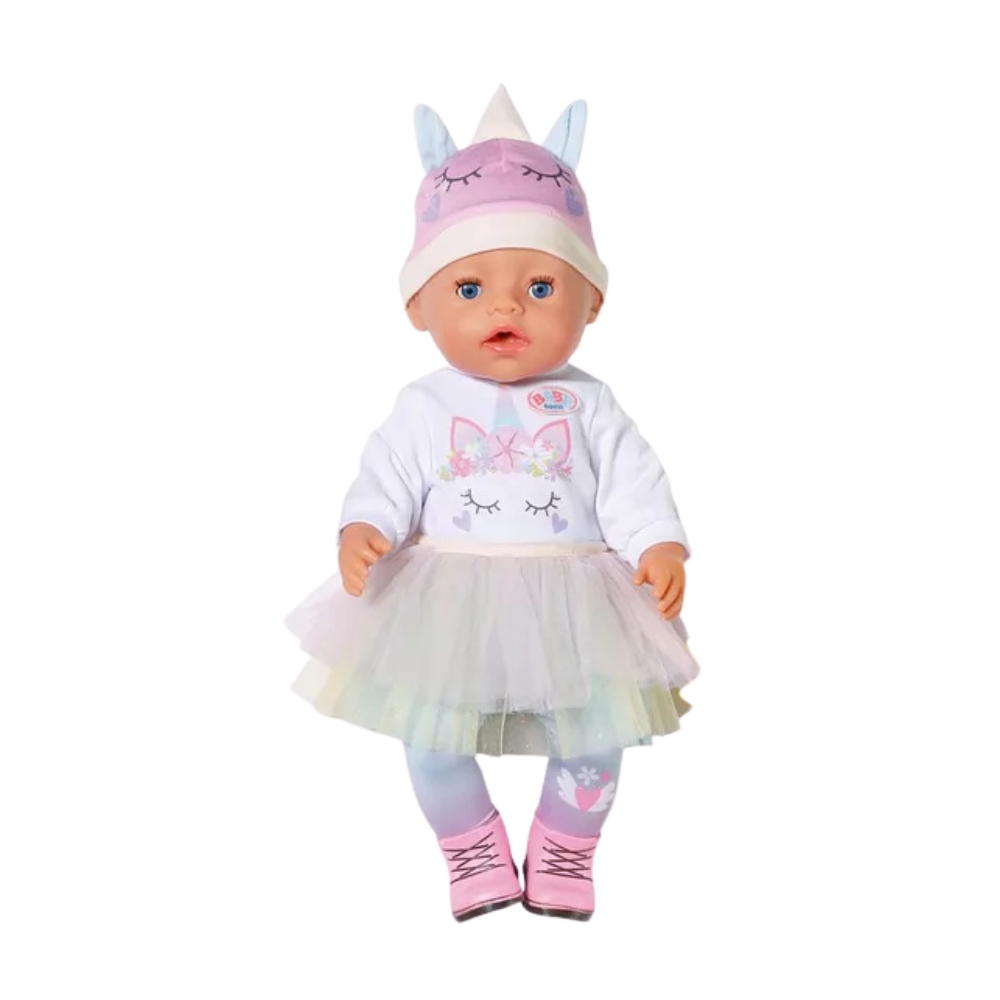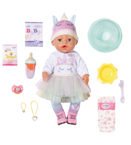 Adorabila papusica Baby Born intr-o rochie incredibila cu unicorn! Ea bea apa dintr-o sticla, isi poate uda scutecul, merge la olita si chiar plange cu lacrimi. Pe langa faptul ca bea dintr-o sticla, ea face deja primele incercari de a manca cu lingura.