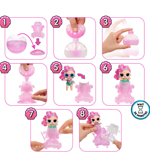 Creeaza o coada magica pentru mica ta sirena folosind geluri stralucitoare! Pentru a face acest lucru, aseaza forma pentru coada pe suport, adauga gelul din sticla colorata in sticla alba (mai mare) si amesteca continutul. Toarna gelul in forma, pune papusa in vesta, fixeaza cu cleme si asteapta 5-10 minute sa se intareasca. Apoi scoate uniforma si admira-ti creatia!