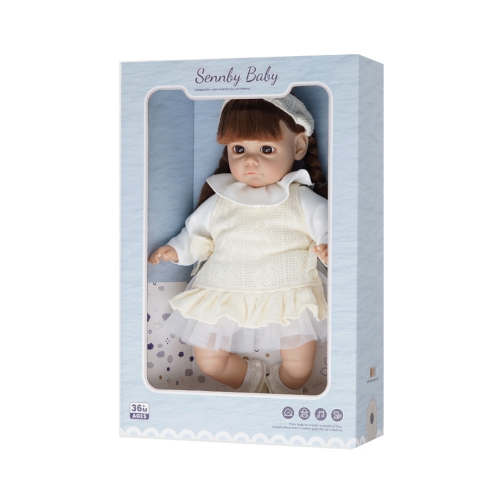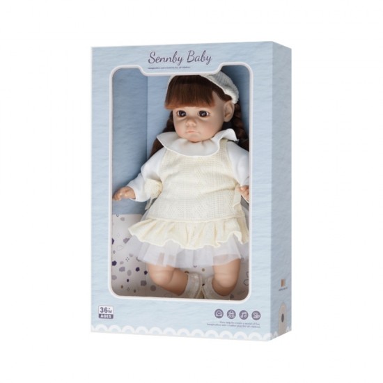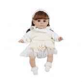 Papusa cu corp moale si 6 sunete 35 cm bruneta cu rochie alba, ZJA329541