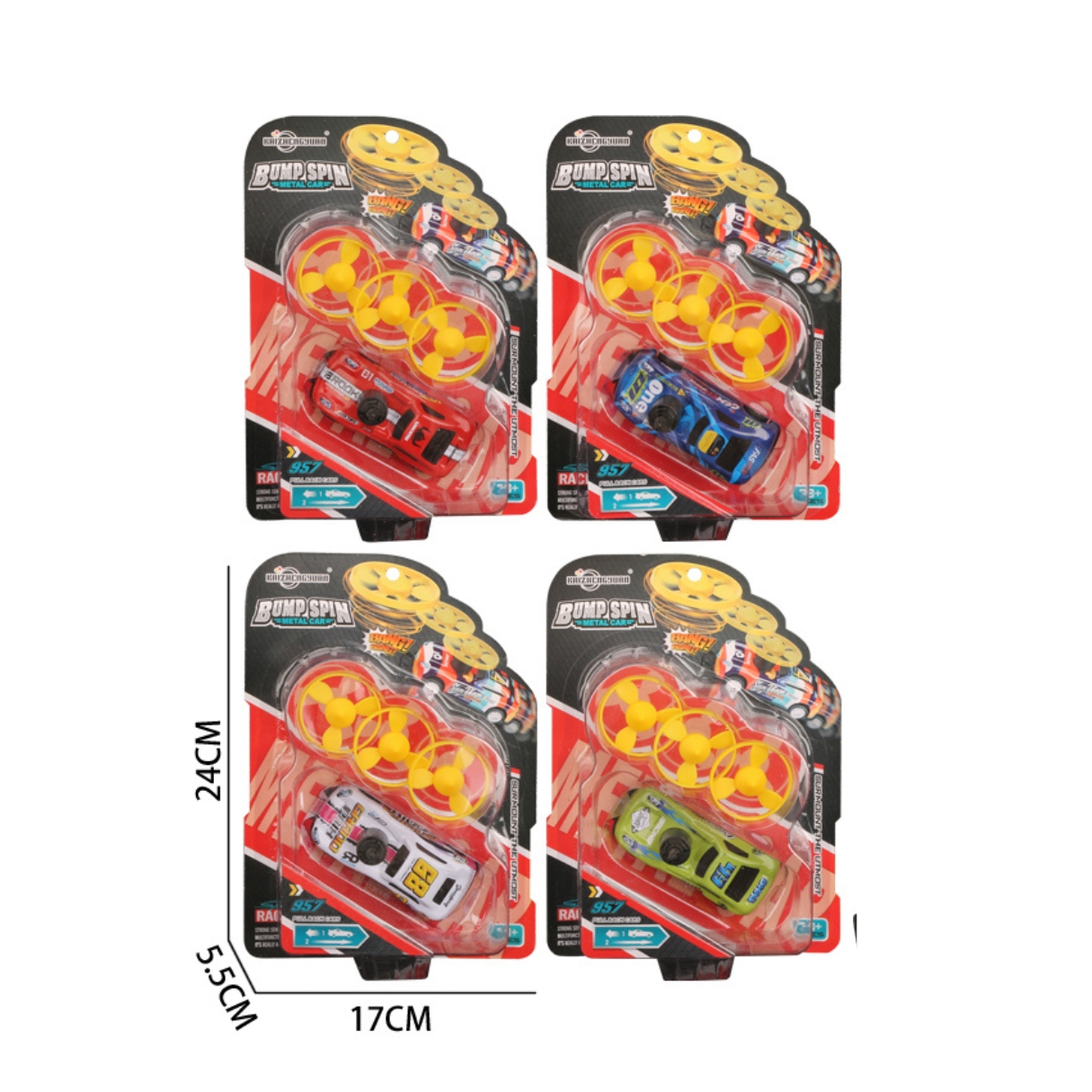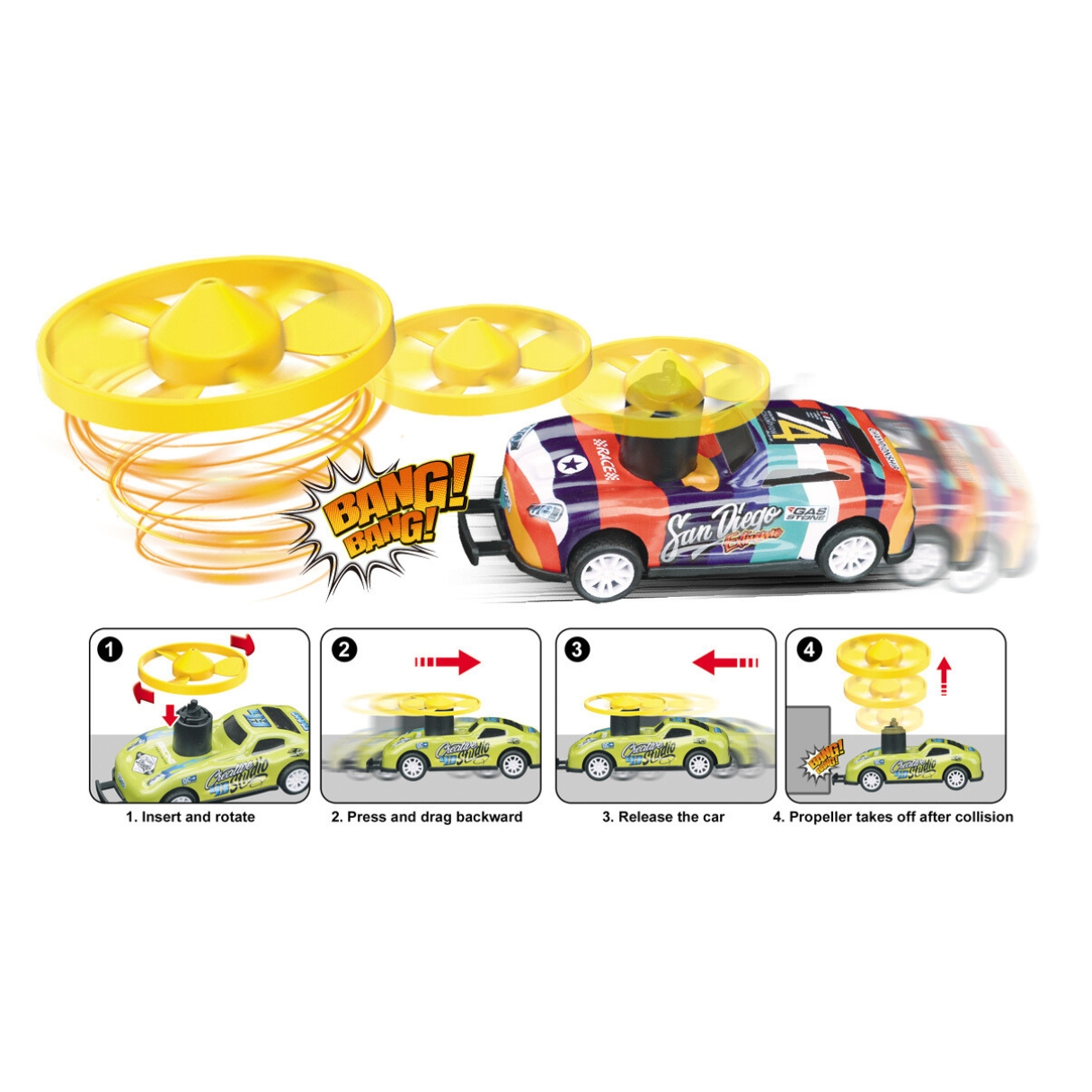 Masinuta detine mecanismul Pull-Back, trage masina,elibereaza-o si priveste cum merge inainte. Mai mult, ca jocul sa fie si mai distractiv in set vei gasi trei elice pentru lansator.