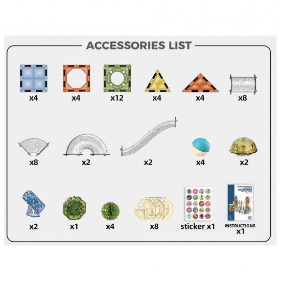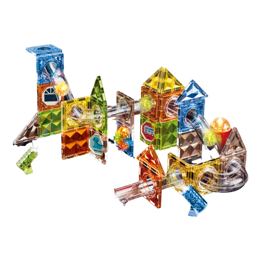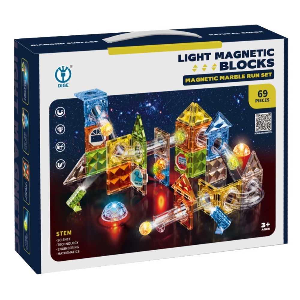 Setul de constructie magnetic cu lumini, compus din 69 de elemente, iti va oferi o experienta unica si captivanta de joc, combinand magia magnetismului cu un traseu interactiv pentru bile. Acest set este conceput pentru a stimula creativitatea, gandirea logica si coordonarea mana-ochi. Luminile LED incorporate adauga un efect spectaculos, facand traseul cu bile si mai fascinant.