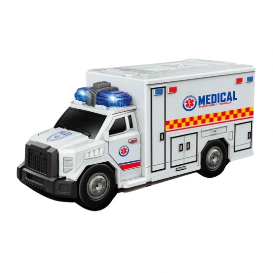 Ambulanta emite sunete specifice, cum ar fi zgomotul sirenei, care imita sunetul real al unei autospeciale. Echipata cu lumini care se aprind in timpul utilizarii, camionul adauga un element vizual atragator. Jucaria asigura un mecanism de frictiune, care ii permite sa se deplaseze inainte dupa ce este impinsa.