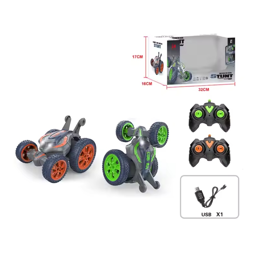 Masina Stunt cu telecomanda (RC), perfecta pentru iubitorii de adrenalina si performanta. Designul sau robust si culorile vibrante de verde sunt completate de lumini LED care adauga un efect spectaculos in timpul jocului.