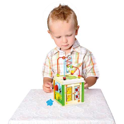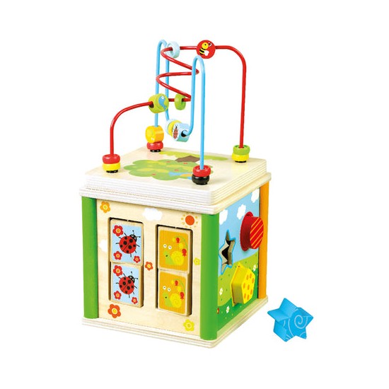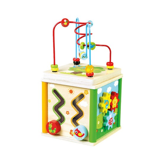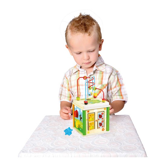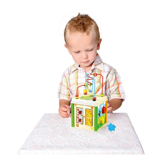 Cubul educativ este o jucarie motrica datorita partii superioare care reprezinta un traseu complicat pe care se misca bilele, este o jucarie educativa pentru ca exista laturi cu labirint, numaratoare, ceas, acestea ajutand la invatarea notiunilor esentiale pentru lumea din jur.