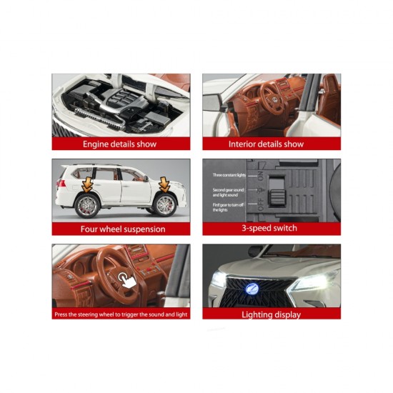 Macheta auto Lexus LX570 este o piesa de colectie impresionanta pentru toti amatorii si colectionarii de autovehicule. Macheta este echipata cu functia pullback, ceea ce iti permite doar sa o tragi putin inapoi iar ea se va deplasa singura, realizata la scara 1:24, toate usile pot fi deschise. Este fabricata din metal durabil si echipata cu sunete si lumini functionale, ceea ce o face o jucarie super interactiva.