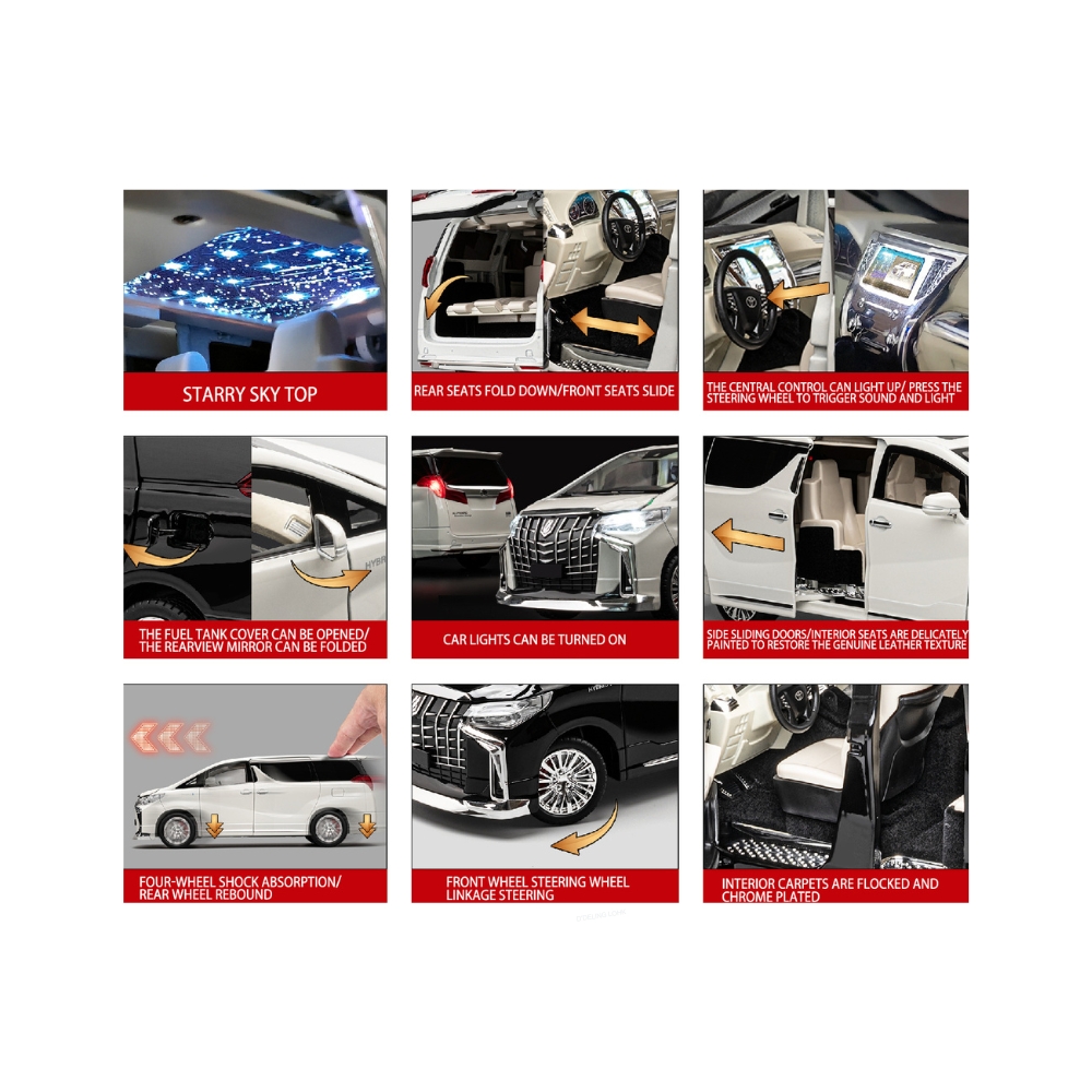 Macheta auto Toyota Alphard este o piesa de colectie impresionanta pentru toti amatorii si colectionarii de autovehicule. Macheta este echipata cu functia pullback, ceea ce iti permite doar sa o tragi putin inapoi iar ea se va deplasa singura, realizata la scara 1:18, toate usile pot fi deschise. Este fabricata din metal durabil si echipata cu sunete si lumini functionale, ceea ce o face o jucarie super interactiva.