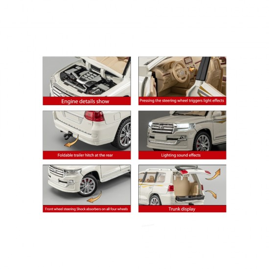 Macheta auto Toyota Land Cruiser este o piesa de colectie impresionanta pentru toti amatorii si colectionarii de autovehicule. Macheta este echipata cu functia pullback, ceea ce iti permite doar sa o tragi putin inapoi iar ea se va deplasa singura, realizata la scara 1:24, toate usile pot fi deschise. Este fabricata din metal durabil si echipata cu sunete si lumini functionale, ceea ce o face o jucarie super interactiva.
