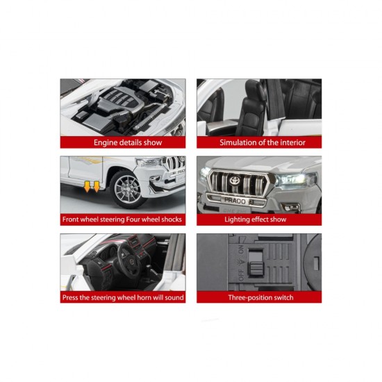 Macheta auto Toyota Land Cruiser Prado este o piesa de colectie impresionanta pentru toti amatorii si colectionarii de autovehicule. Macheta este echipata cu functia pullback, ceea ce iti permite doar sa o tragi putin inapoi iar ea se va deplasa singura, realizata la scara 1:24, toate usile pot fi deschise. Este fabricata din metal durabil si echipata cu sunete si lumini functionale, ceea ce o face o jucarie super interactiva.