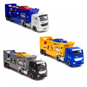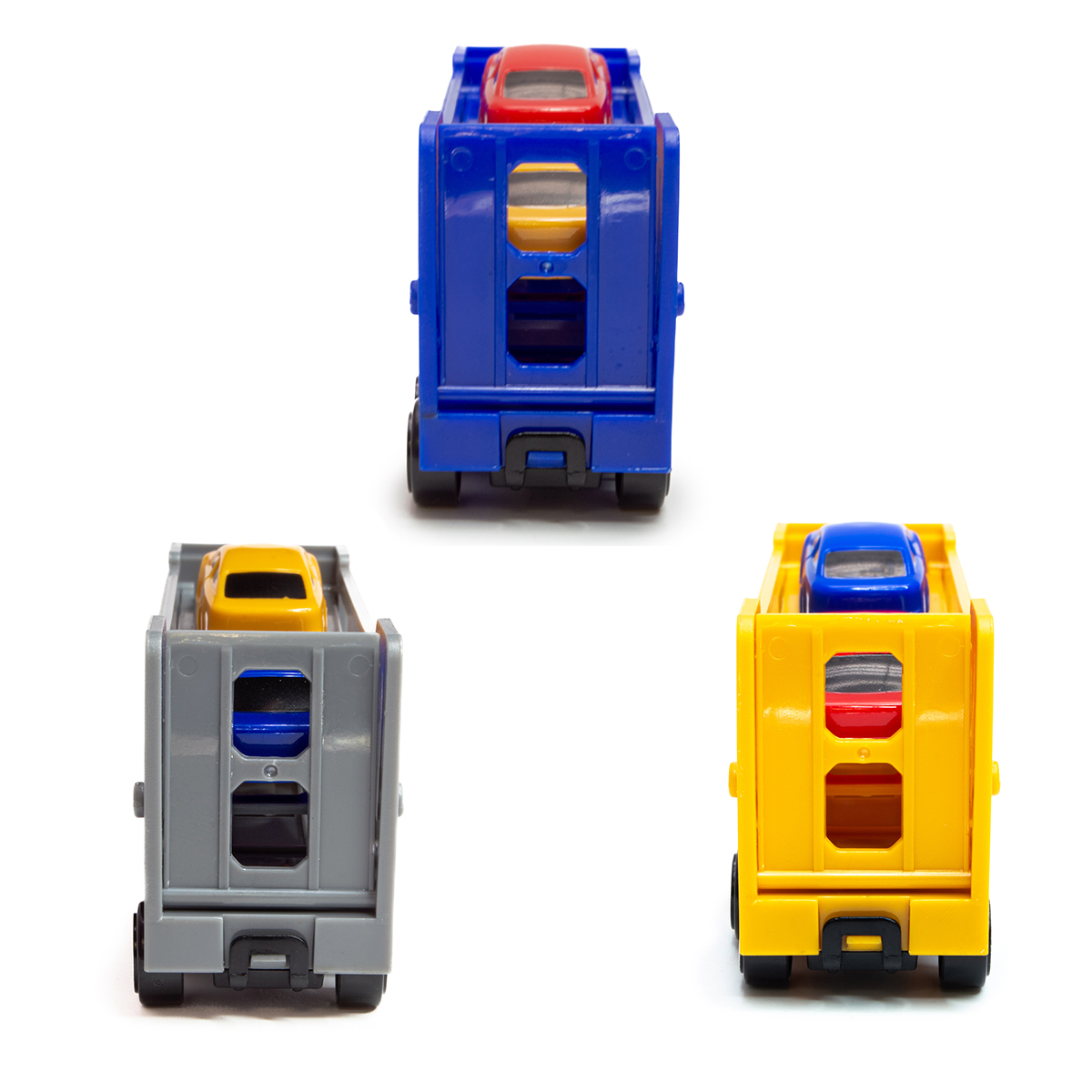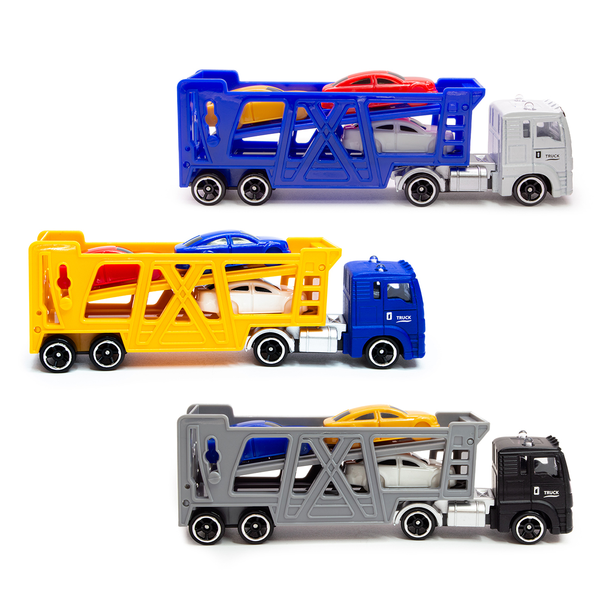 Autotransportorul are usi spate care se deschid si un podea/pandusp mobil manual, astfel incat copilul poate interactiona cu modelul si poate imagina scenarii de transport. Masinutele din interior sunt fixate si nu sunt destinate pentru a fi scoase din autotransportor, ceea ce pastreaza setul compact si sigur. Caroseria cabinei este metalica, rezistenta la lovituri, iar ambalajul transparent tip constructie/vitrina se poate stivui usor pentru a crea o colectie frumoasa la vedere.