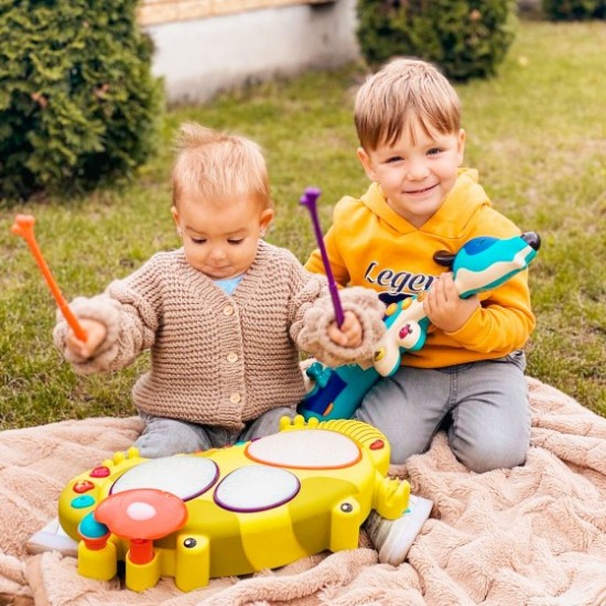Alege ceea ce-ti place cel mai mult - rock, etno, electro pop sau urban! Un buton dedicat transforma sunetele de tambur intr-un hohot amuzant. Jucaria contine mai multe melodii, care pot fi insotite si de tobe. Poti controla volumul muzicii sau o poti opri in totalitate.