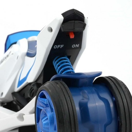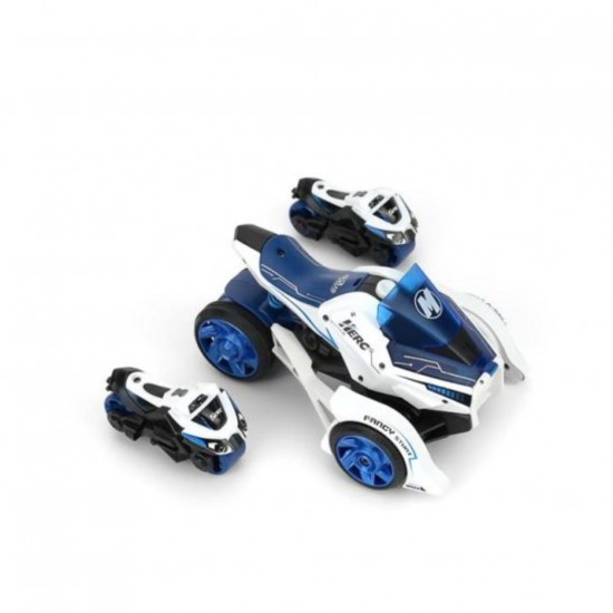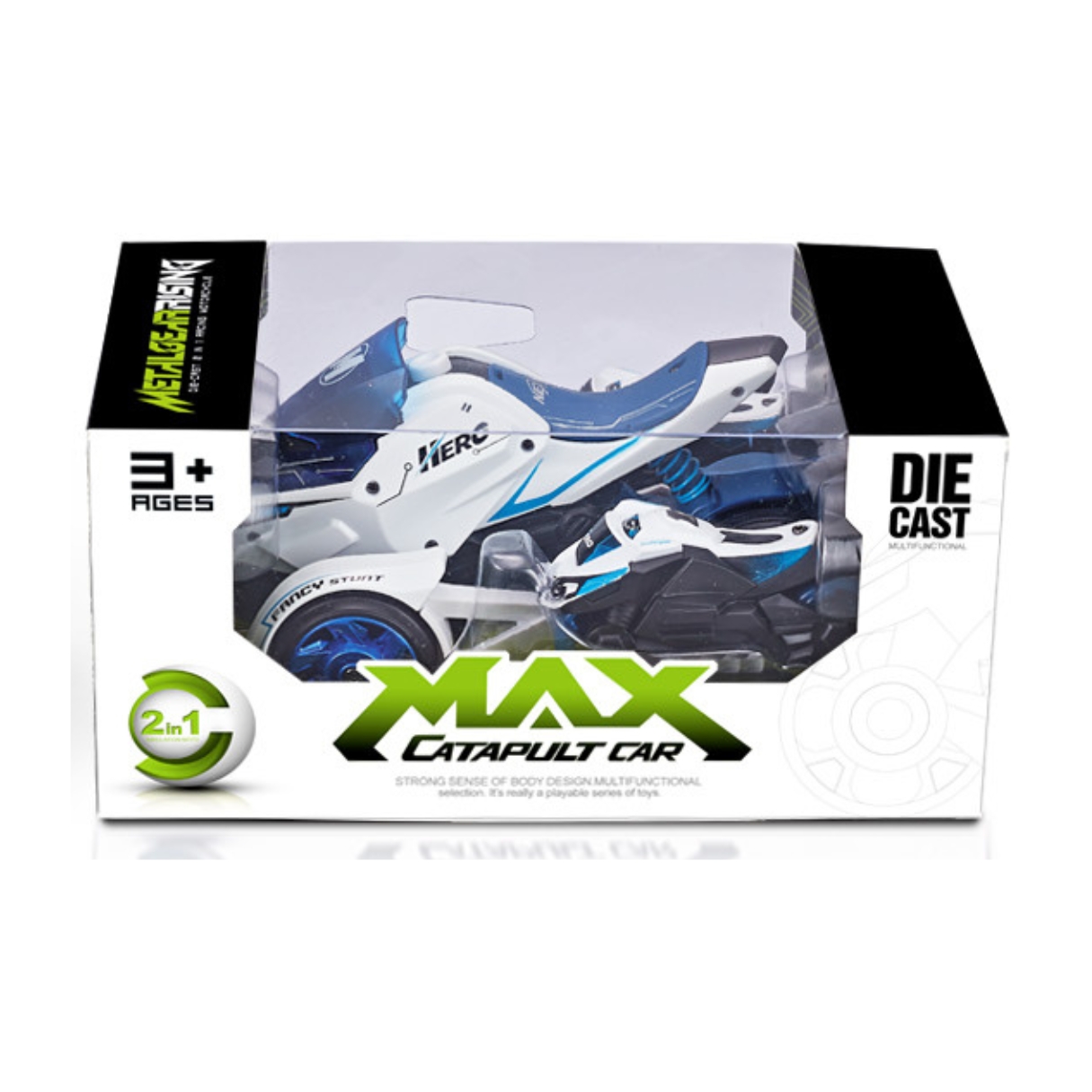 Pachetul include o motocicleta din metal la scara 1:32 care functioneaza si ca lansator, impreuna cu doua motociclete mici. Ele sunt introduse in lansator pentru lansare, oferind mai multe moduri de a te bucura de jucarie.