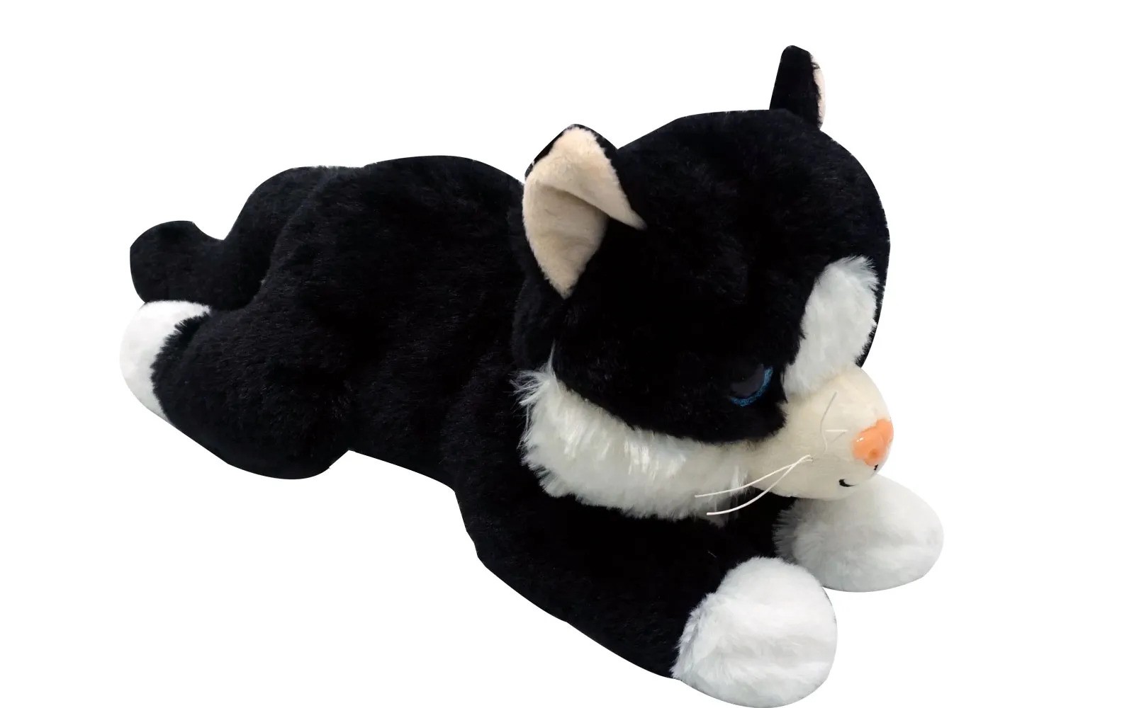 Aceasta jucarie de plus in pozitie culcata, cu o lungime de aproximativ 35 cm, este confectionata din material moale si pufos, cu blanita foarte placuta la atingere, mustati albe lungi, labe micute si un nas in forma de inima.