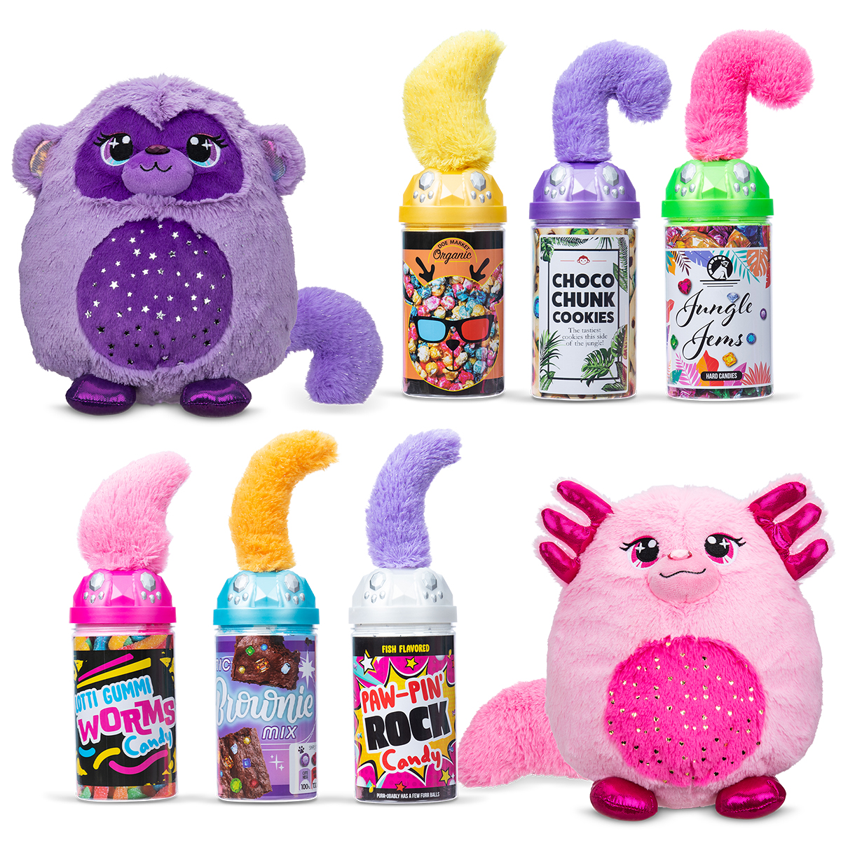 Fiecare animalut are un design unic, fiind inspirat de pietre pretioase: lemur cu nas smarald, cerb cu nas rubin, maimuta cu ametist, vulpita cu aquamarin, axolotl cu safir roz si pisicuta cu diamant - colecteaza-i pe toti!