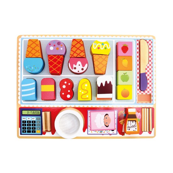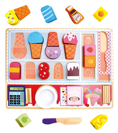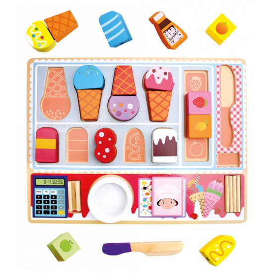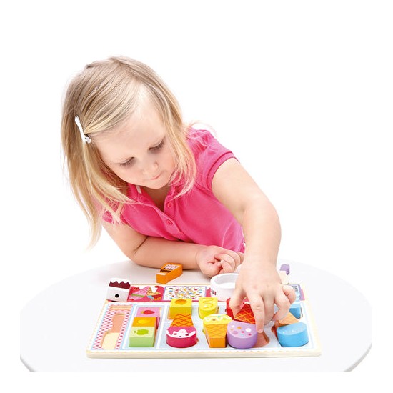 Un puzzle cu piese din lemn colorate si o baza din lemn care va aduce bucurie fiecarui creator de inghetata.
