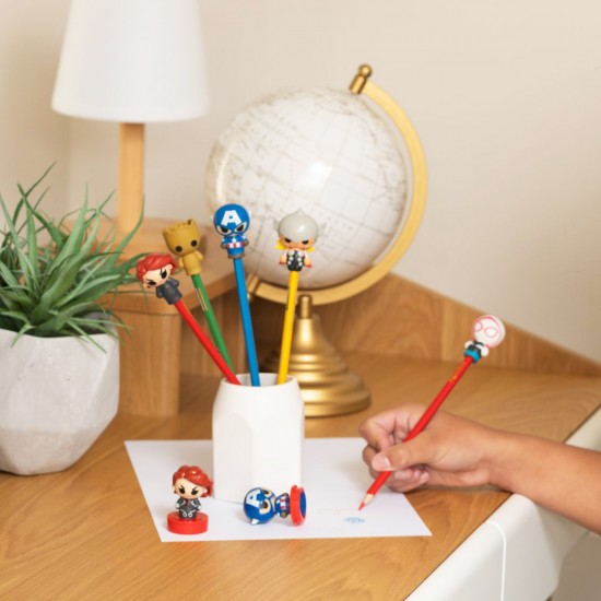 Faceti cunostinta cu eroii tai preferati din universul Marvel! Topperurile colorate "Bop n Tops" adauga creativitate si distractie scrisului sau sarcinilor de zi cu zi. Figurinele pot fi puse pe un creion sau pix. Alege ce erou iti place cel mai mult?