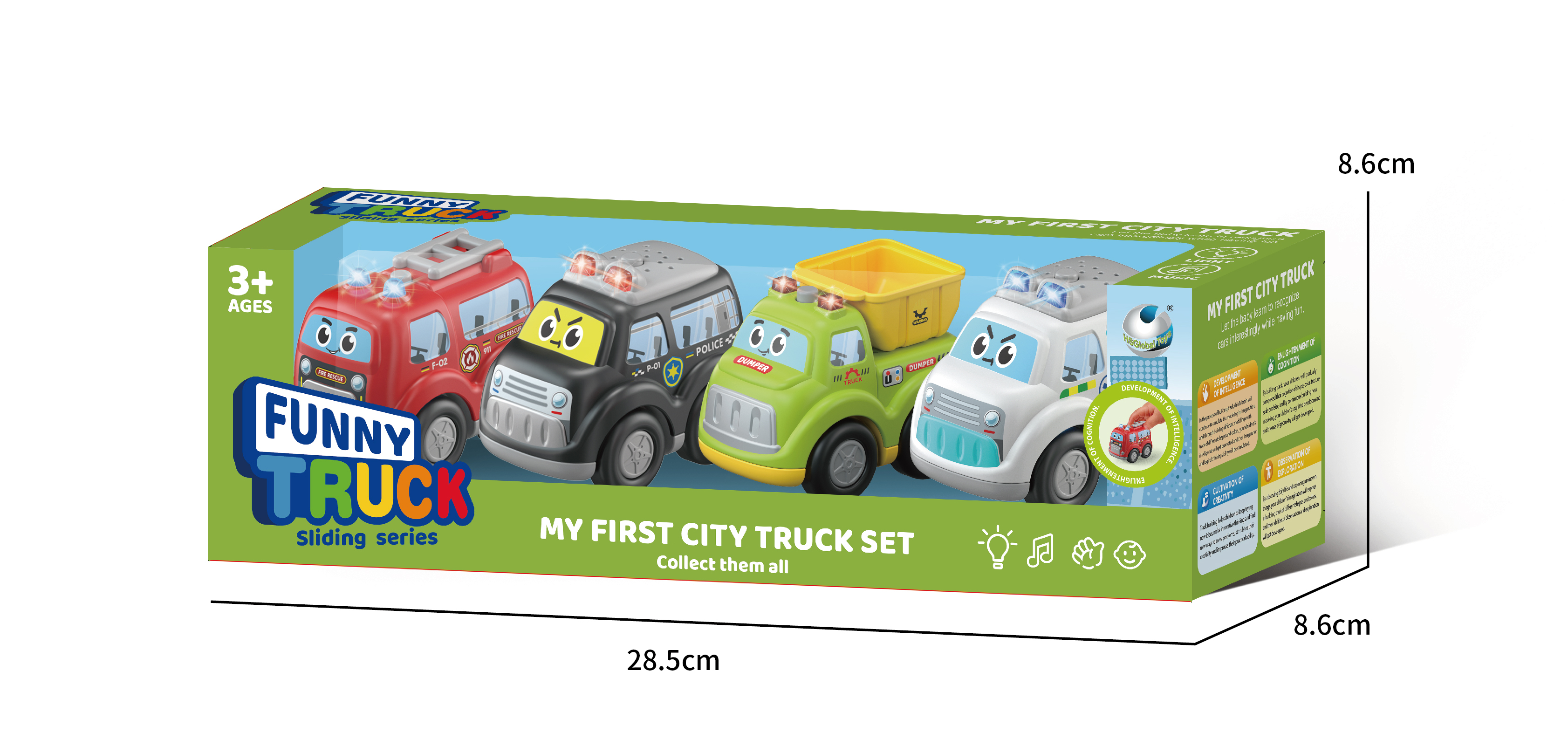 Incurajeaza micii exploratori sa descopere orasul cu setul interactiv "My First City Truck"! Acest set contine 4 vehicule esentiale cu design vesel si culori vibrante: o masina de pompieri, o masina de politie, un camion basculanta si o ambulanta. Fiecare masinuta este echipata cu functii captivante de sunete si lumini care se activeaza la joaca, stimuland simturile si curiozitatea copiilor.
