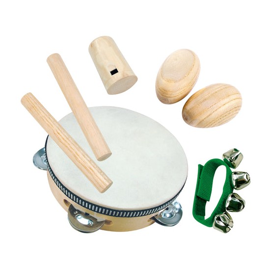 Setul contine: 1 tamburina, 2 maracase, 2 bratari cu clopotei, 1 fluier, 2 bete din lemn.