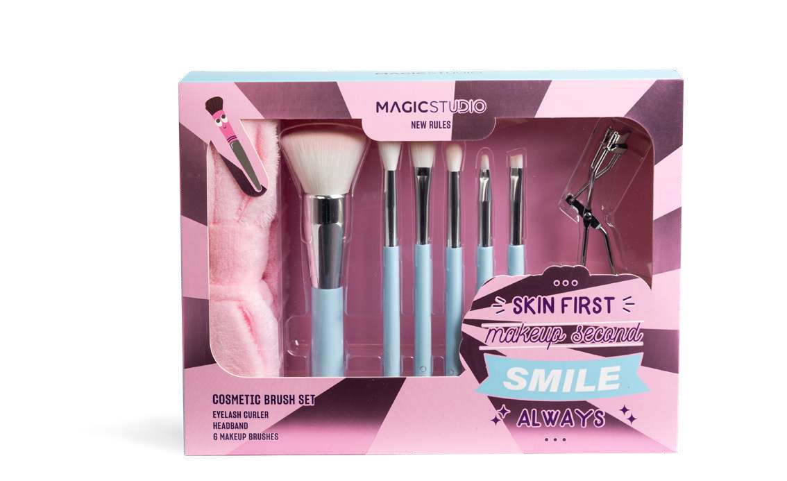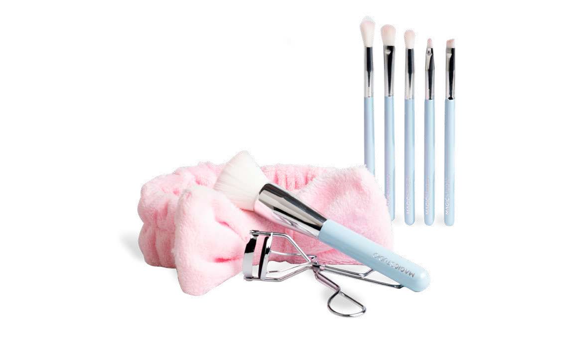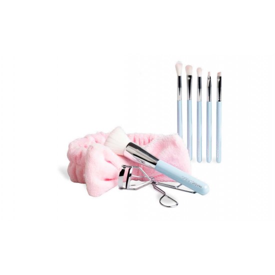 Ele bine se potrivesc pentru aplicarea pudrei, fondului de ten, fardului de obraz si fardului de pleoape. Mai mult, pe langa cele 6 pensule vei mai gasi un curler si o bentita spa.