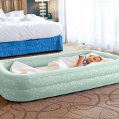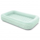 Patul gonflabil Kidz Travel este solutia ideala pentru calatorii, oferind siguranta si confort copiilor cu varsta intre 3 si 6 ani. Acesta este format dintr-un cadru exterior stabil si o saltea interioara detasabila (71 x 132 x 10 cm), care poate fi utilizata si separat. Marginile laterale inalte previn alunecarea accidentala a copilului in timpul somnului. Suprafata de dormit este impermeabila si placuta la atingere. Setul include o pompa manuala pentru umflare rapida si o geanta pentru transport, fiind foarte practic pentru vacante sau vizite.
