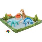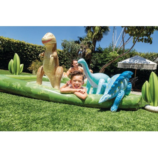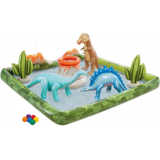 Centrul de joaca gonflabil "Jurassic Adventure" de la INTEX este locul perfect pentru distractia copiilor! Include dinozauri gonflabili, un vulcan cu bile si cactusi, creand o atmosfera autentica a epocii preistorice. Centrul este echipat cu un pulverizator integrat, care se conecteaza la furtunul de gradina, pentru a oferi si mai multa distractie copiilor.