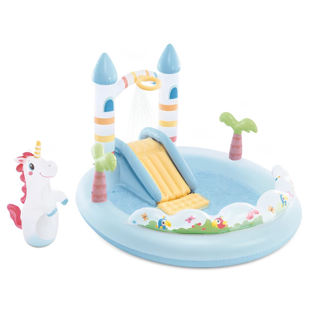 Paseste intr-o lume magica a distractiei cu centrul de joaca Intex Unicorn Castle! Acest castel fermecat este paradisul acvatic perfect pentru cei mici, oferind o experienta completa de joaca: un tobogan moale cu aterizare protejata, un inel pentru aruncari la tinta si un personaj unicorn gonflabil de tip Bop bag inclus. Arcul castelului se transforma intr-o stropitoare delicata prin simpla conectare la furtunul de gradina, oferind racoare in zilele de vara. Setul vine echipat si cu 8 mingi colorate, asigurand ore intregi de divertisment activ in siguranta.