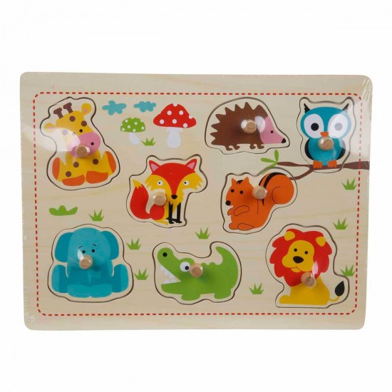 Puzzle din lemn cu buton Animale Salbatice, 8 el, Woody
