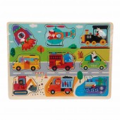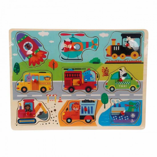 Puzzle din lemn cu buton Vehicule Transport, 9 el, Woody