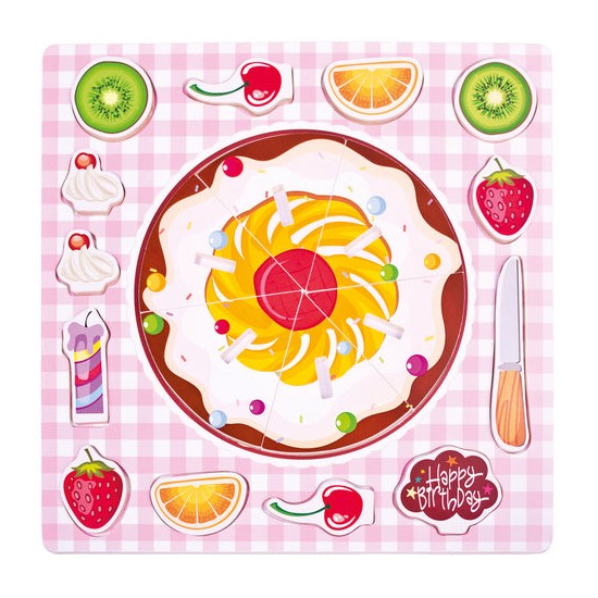 Puzzle din lemn, tort de ziua de nastere. Ingredientele pentru tort pot fi asezate pur si simplu la suprafata sau in gauri speciale. Setul contine un cutit din lemn si semnul "La multi ani". Bun pentru antrenarea abilitatilor de concentrare, consideratie si observare, precum si pentru gandirea logica si luarea deciziilor in gasirea pieselor potrivite.