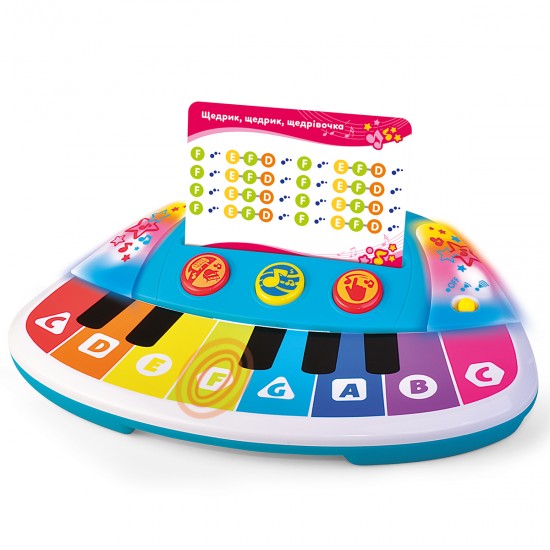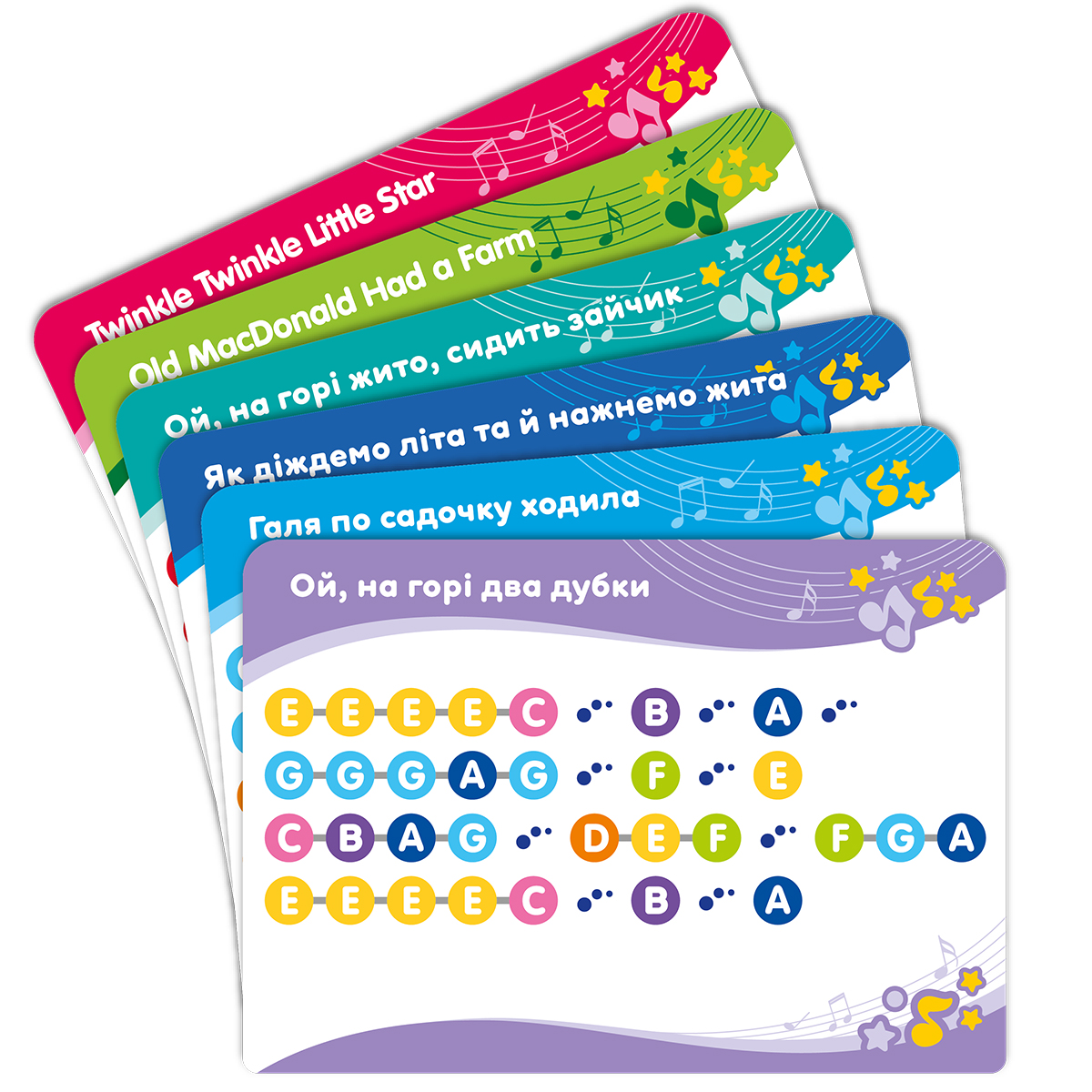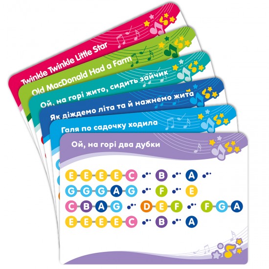 12 clape colorate contin 24 melodii, iar culorile ajuta copilul sa memoreze mai usor notele. In plus, setul include 6 efecte sonore pentru joaca variata si 12 carduri muzicale cu note din cantecele ucrainene si englezesti. Cardurile se introduc intr-un loc special, iar copilul poate canta urmarind fie culorile, fie literele notelor. Volumul este reglabil pentru confort acasa sau in calatorii, iar spatiul de depozitare pentru carduri mentine totul ordonat.