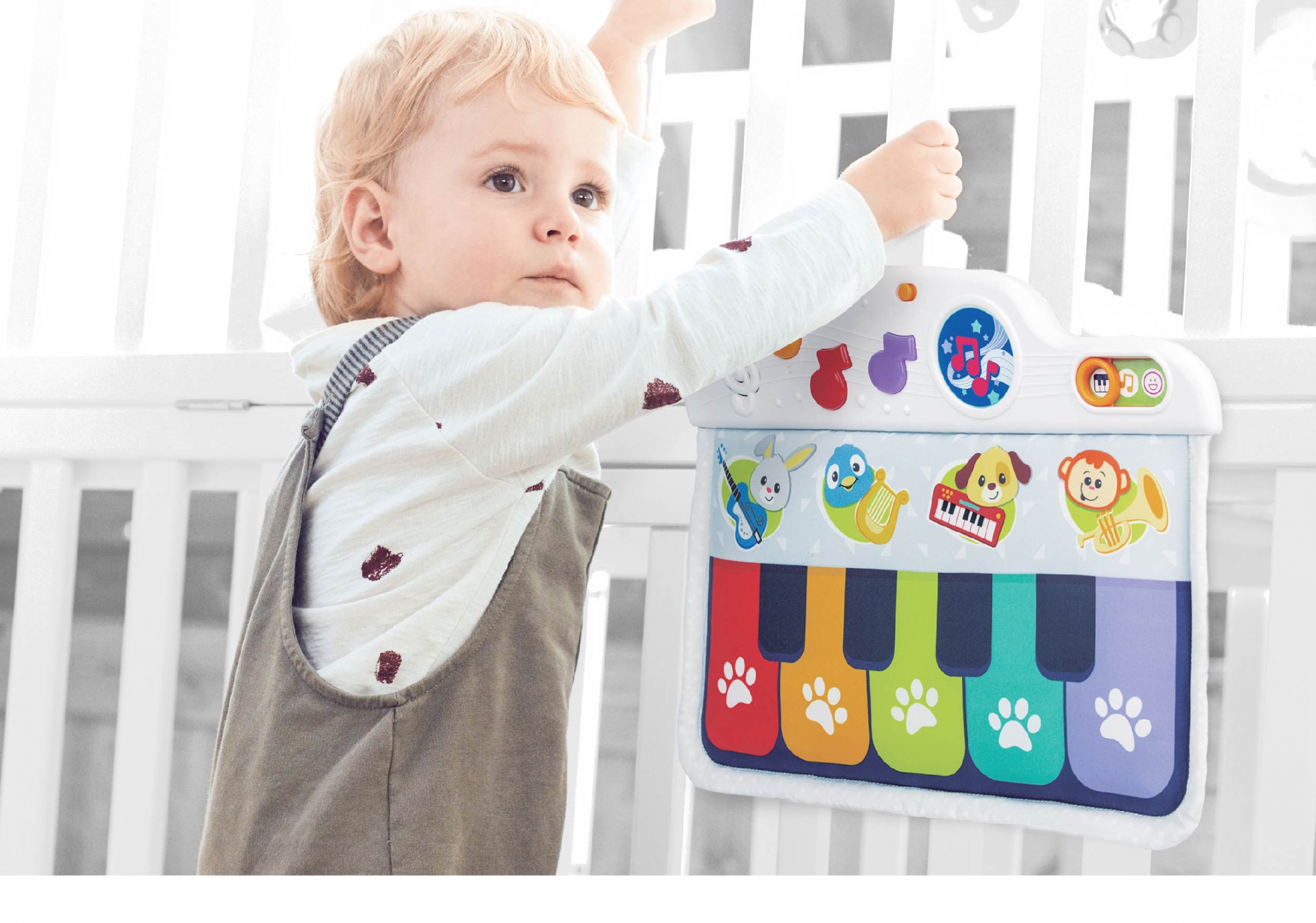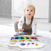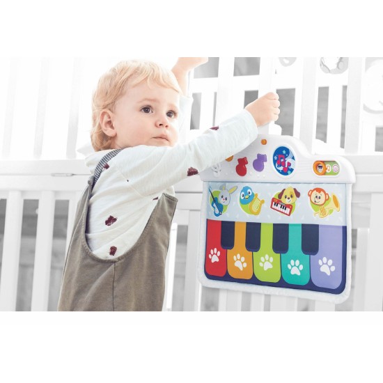 Cu element de agatat il poti atarna oriunde pentru a explora aceasta jucarie interactiva. Apasa clapele textile si descopera sunetele si luminile ce le reda jucaria.