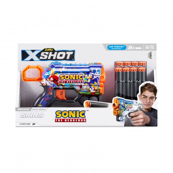 Alege Blasterul X-Shot Skins Menace,Sonic Mega si alatura-te luptei! Acest blaster nu trebuie sa lipseasca din colectia ta. Are stocare inferioara pentru sageti, astfel incat sa il puteti reincarca rapid si sa va intoarceti in lupta. X-Shot Skins dispun de noua tehnologie Air Pocket pentru impuscaturi mai rapide, mai lungi si mai precise.