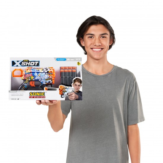 Alege Blasterul X-Shot Skins Menace,Sonic Super Speed si alatura-te luptei! Acest blaster nu trebuie sa lipseasca din colectia ta. Are stocare inferioara pentru sageti, astfel incat sa il puteti reincarca rapid si sa va intoarceti in lupta. X-Shot Skins dispun de noua tehnologie Air Pocket pentru impuscaturi mai rapide, mai lungi si mai precise.